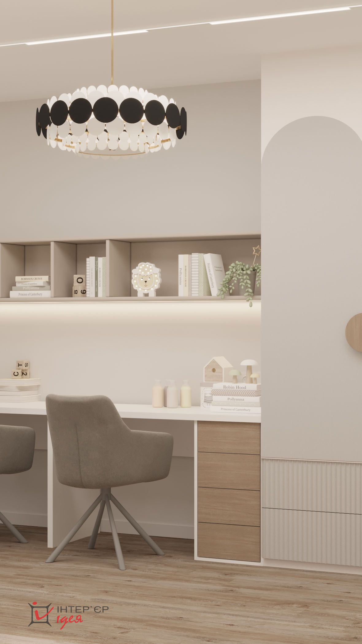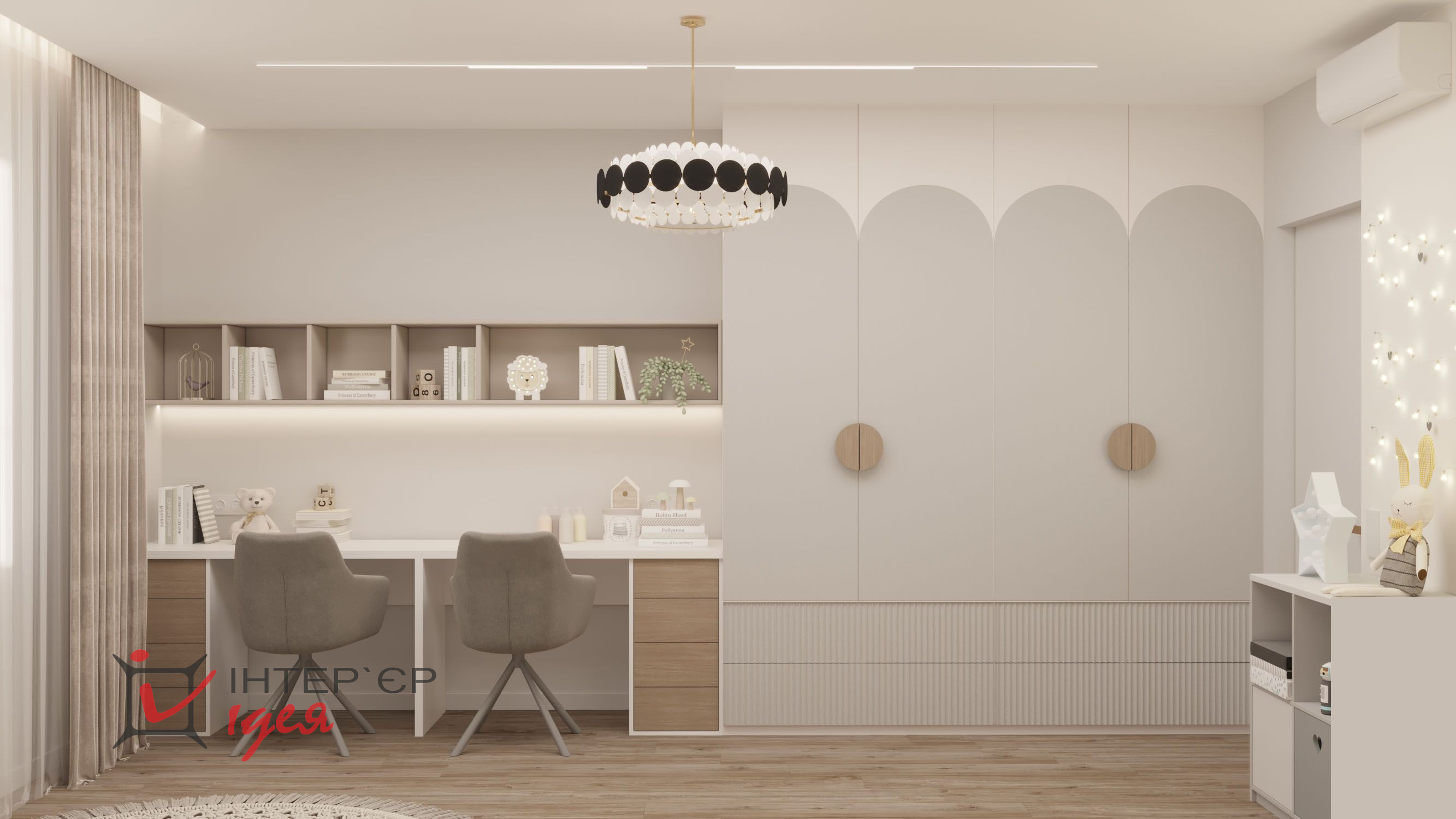 М'яке освітлення забезпечують стильні настінні світильники біля ліжка та гірлянди у вигляді зірочок, що створює чарівну, казкову атмосферу. На підлозі лежить плетений круглий килим, який доповнює загальну гармонію дизайну. Декоративні елементи, такі як м'які іграшки та книжкові полиці, роблять кімнату функціональною та теплою. Велике вікно з легкими шторами забезпечує природне освітлення.