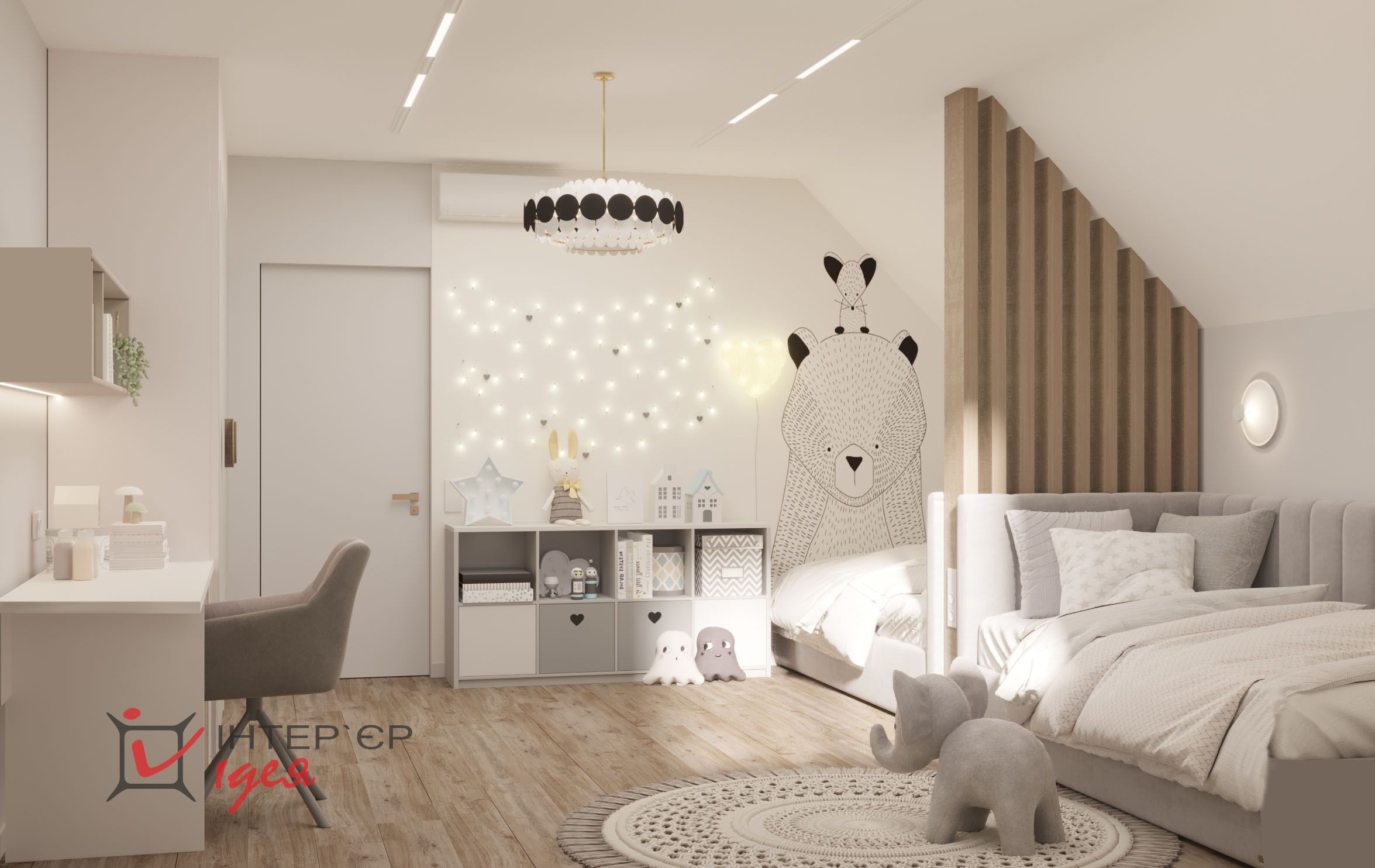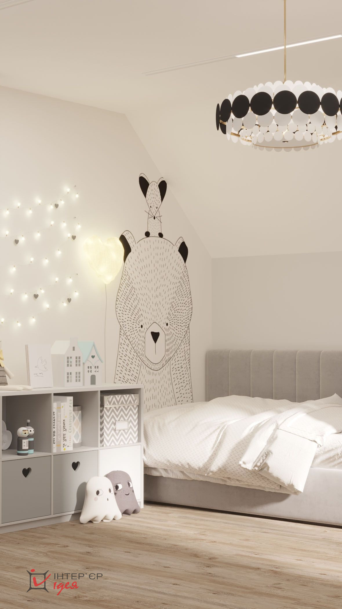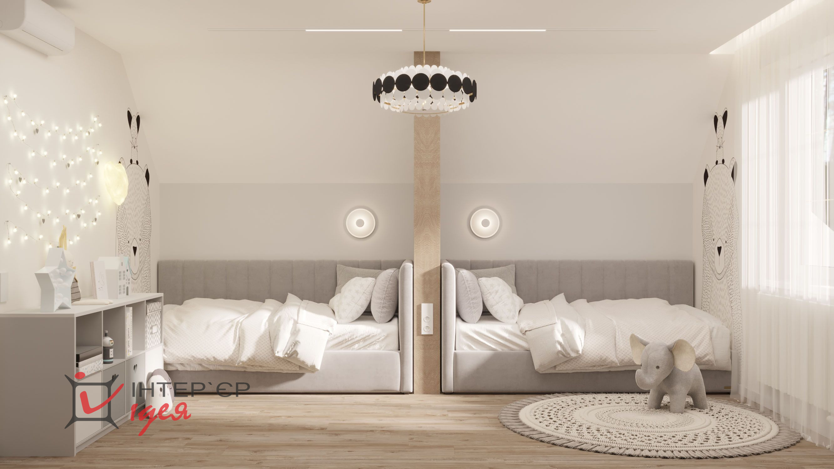 Два однакові ліжка з м'якими сірими узголів'ями розташовані симетрично, розділені дерев'яною стійкістю, що додає структурності інтер'єру. На стінах розташовані милі шпалери з ведмедиками, які надають кімнаті грайливий характер.