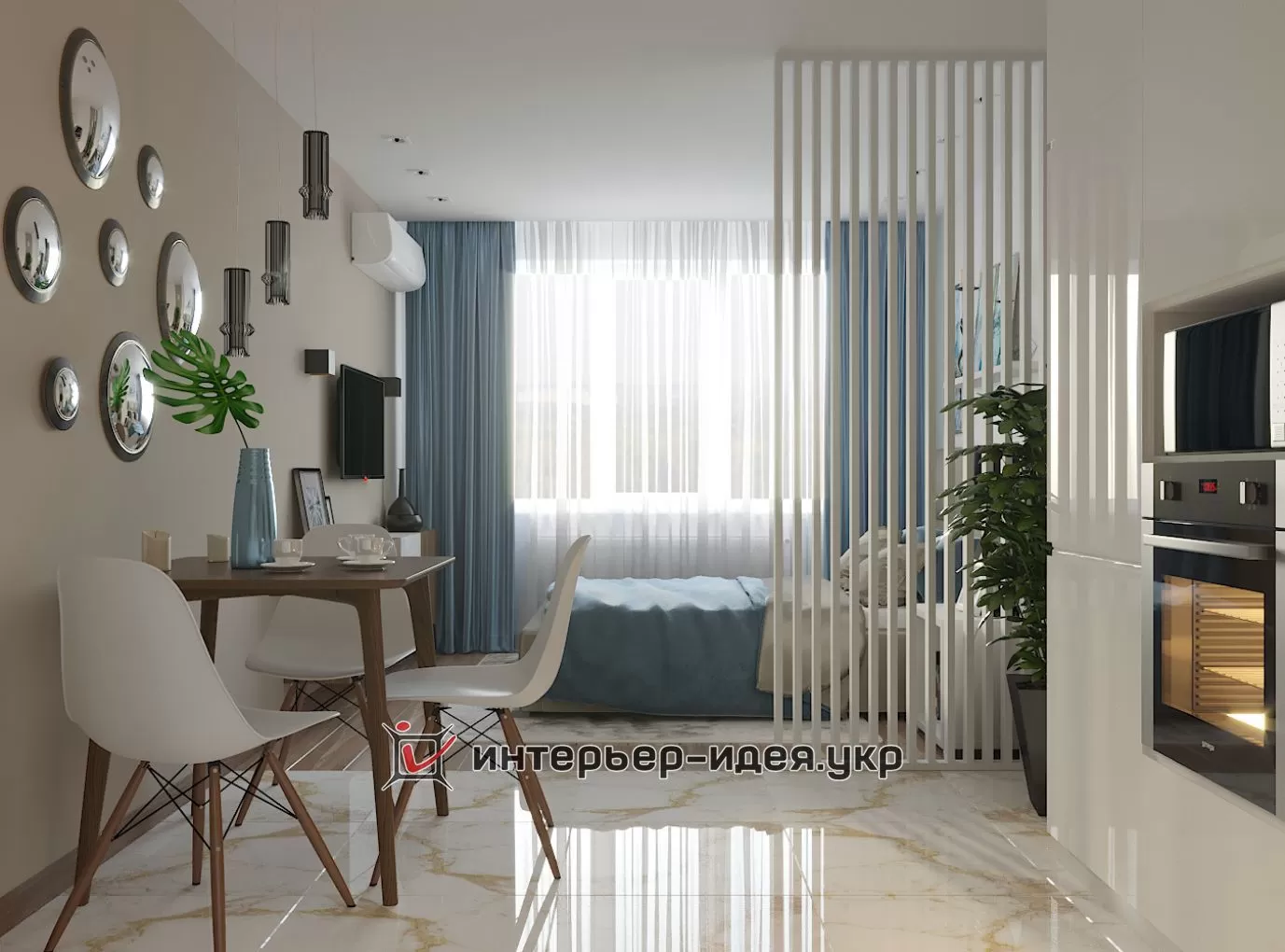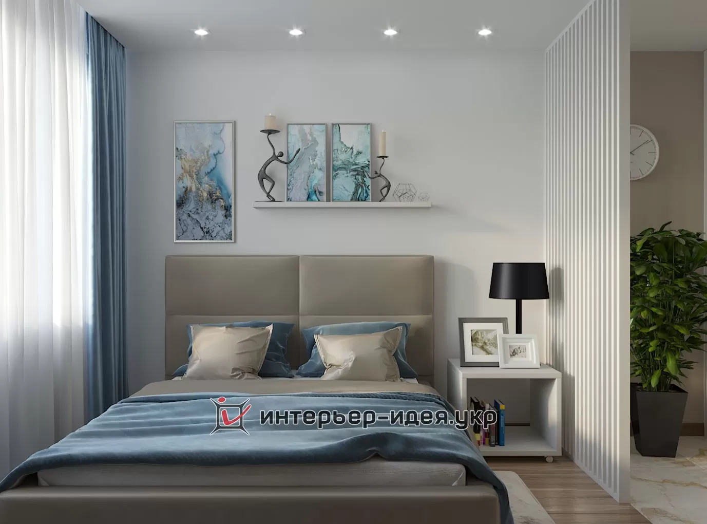 Відокремили зону спальні перегородкою яка зіграла свою декоративну роль в інтер'єрі.