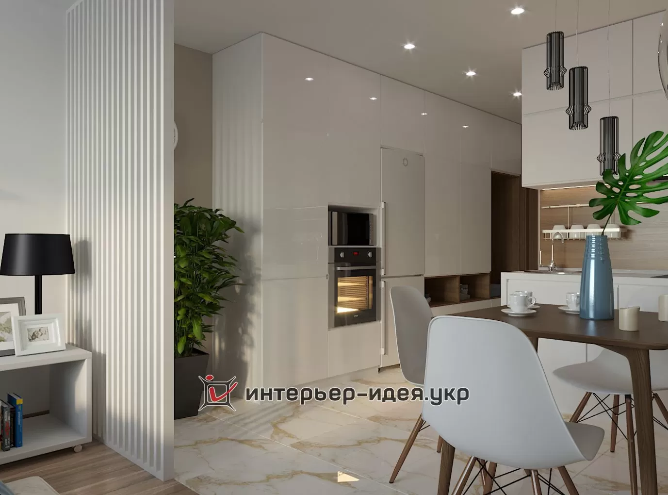 Зробили маленьку зону кухні, замовнику цього було достатньо, за рахунок чого так само заощадили простір.